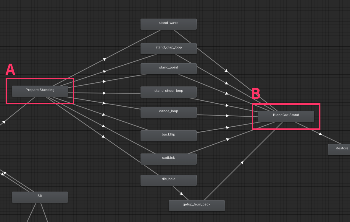 アバター Action レイヤーで Emote 分岐が開始される基準ステート名です。 (A)