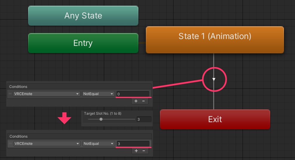 VRCEmote == 1조건이 포함되어 있어도, 사용자가 슬롯 3으로 설치하면 빌드 결과에서는VRCEmote == 3으로 변환됩니다. - 이 치환은 템플릿 내부의 모든 전이 조건에 적용됩니다.