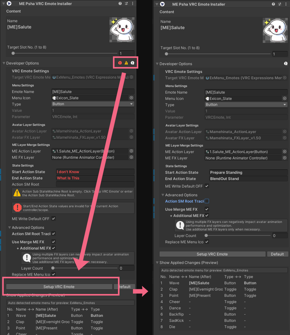 Setup VRC Emote를 실행해 보세요. - 자동 처리가 어려운 항목은 개발자 옵션에서 수동으로 조정할 수 있습니다.